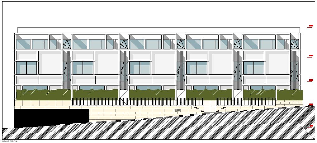 Trata-se da construção de um edifício novo destinado à habitação multifamiliar, com uma área de implantação de cerca de 900,00m2, constituído por três piso elevados e um piso enterrado, onde se inserem cinco moradias triplex.